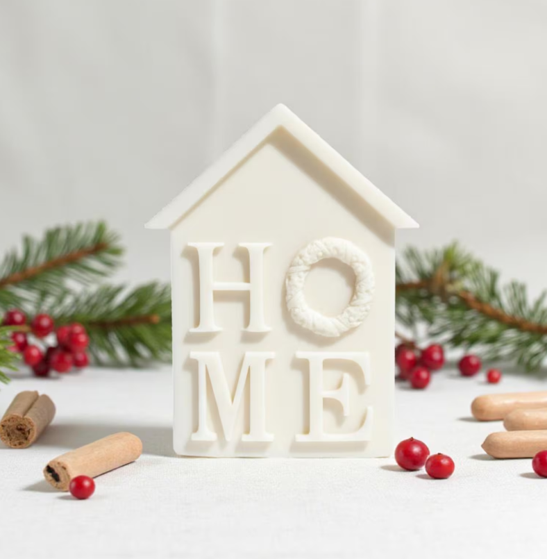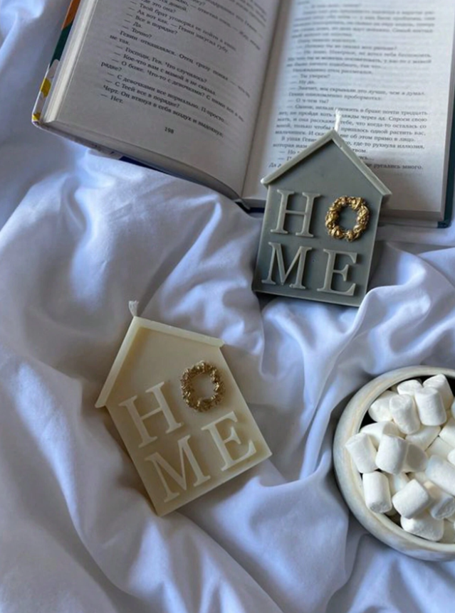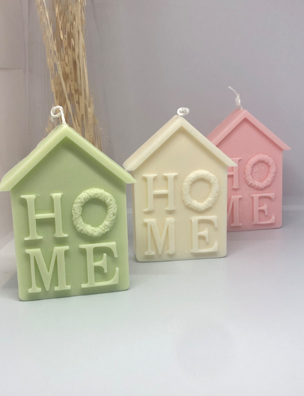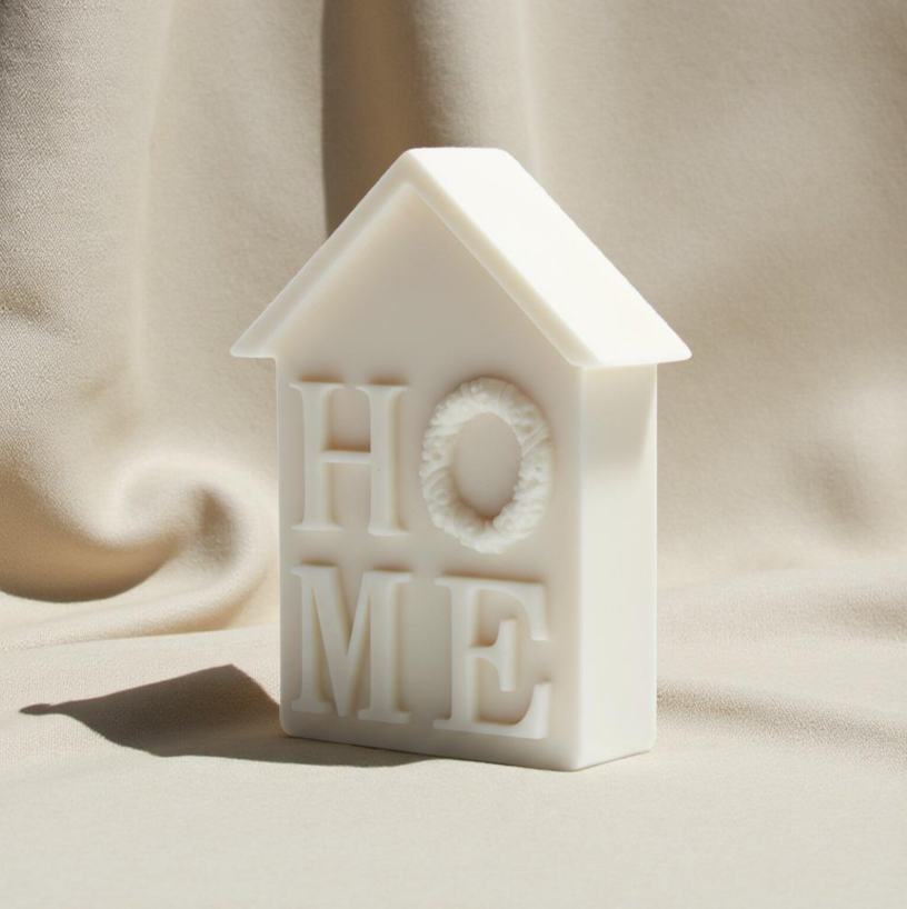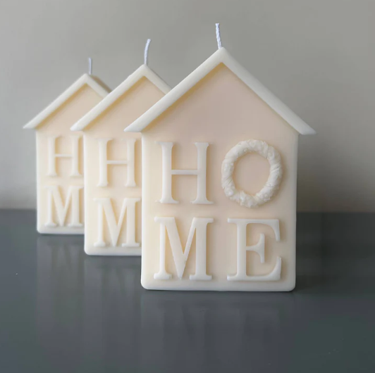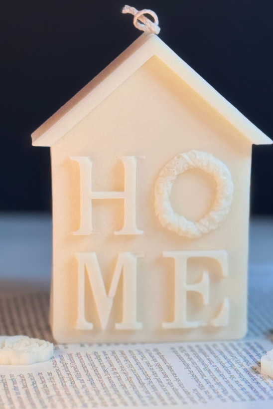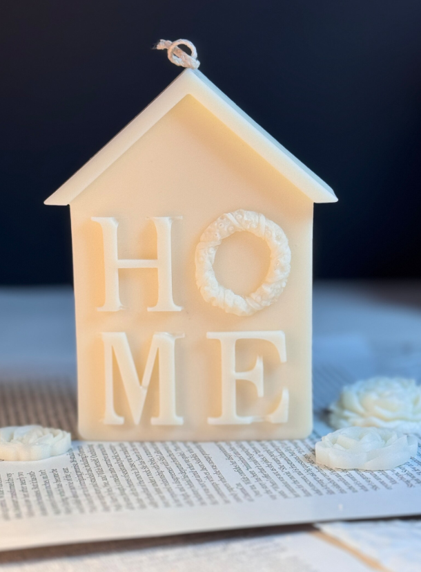 Noel är ett handgjort, husformat blockljus med relieftexten HOME och en liten krans som ringar in O:et – en varm hälsning till hemmet och högtiden.